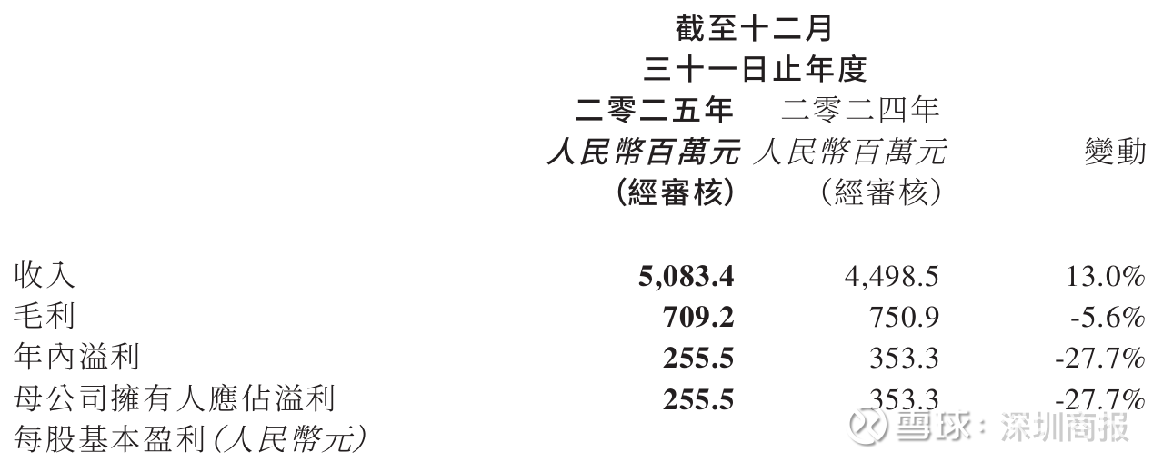 3月25日,双登股份(06960)发布截至2025年12月31日止年度之年度业绩公告。公司实现营业收入约50.83亿元,同比增加13%;毛利为7.09亿元,同比下降5.6%;年内溢利为2.56亿元,同比下降27.7%。