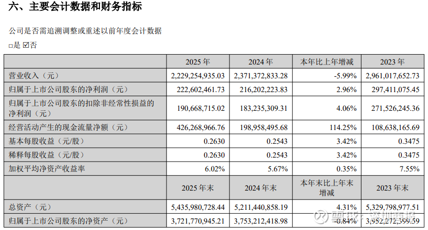 值得关注的是,公司拟向全体股东每10股派发现金股利3元(含税),预计总派发金额为2.54亿元,占2025年归母净利润的114.05%。这一“清仓式分红”是在公司营收连续下滑、控股股东变更的背景下,高比例分红是否影响公司后续发展资金储备,引发市场关注。