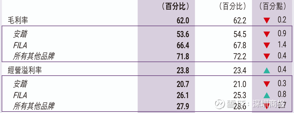 安踏体育在财报中解释称,由于各品牌策略性加强了对专业产品及品质的投入,以及毛利率较低的电商业务占比提升,整体毛利率微降0.2个百分点至62.0%。