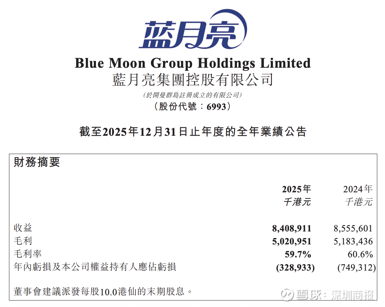 日前蓝月亮集团(06993.HK)发布2025年全年业绩公告。公告显示,截至2025年12月31日,公司实现收益约84.09亿港元,较上年同期的85.56亿港元略微下滑,年内亏损及公司权益持有人应占亏损约3.29亿港元,上年同期亏损7.49亿港元。毛利率自2024年的60.6%跌至59.7%。