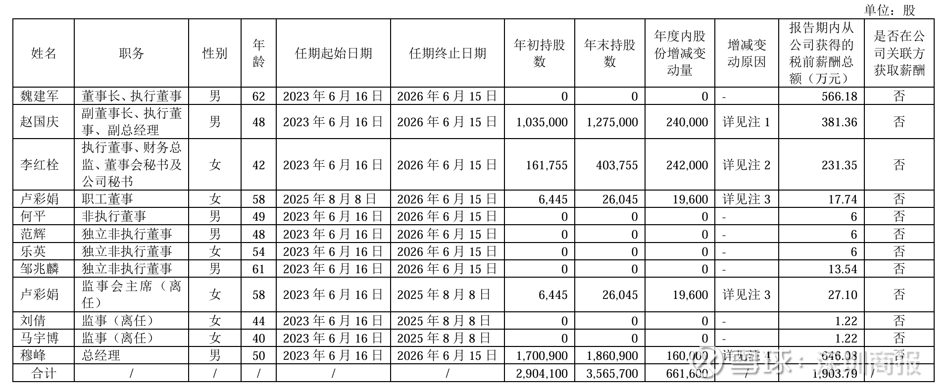 此外,财报显示,2025年,长城汽车董事和高级管理人员薪酬合计1903.79万元(税前),与2024年的1800.6万元相比有所上涨。其中,公司副董事长赵国庆、财务总监李红栓、总经理穆峰均涨薪。