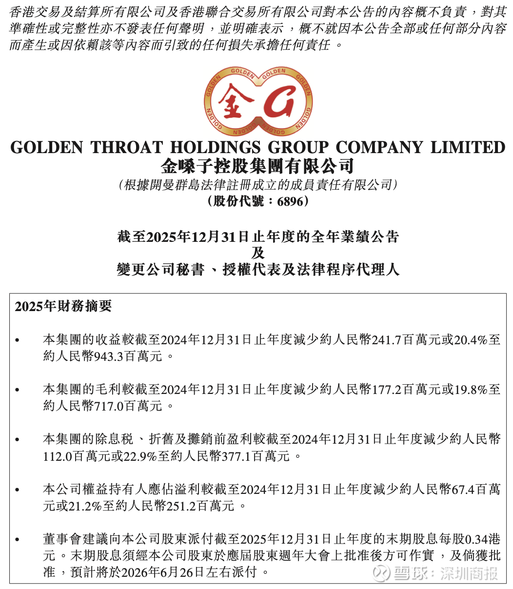 3月27日,金嗓子(06896)发布截至2025年12月31日止年度业绩,该集团取得收益9.43亿元,同比减少20.4%;母公司拥有人应占溢利2.51亿元,同比减少21.16%;每股盈利33.98分,拟派发末期股息每股0.34港元。