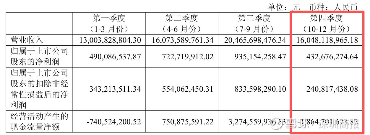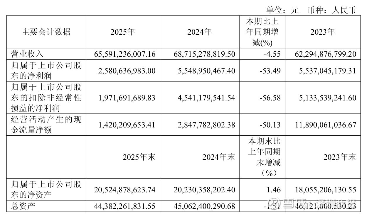 单季度数据显示,公司第四季度营业收入为160.48亿元,同比下降8.1%;归母净利润为4.33亿元,和2024年的16.45亿元相比,同比大幅下降73.68%;扣非净利润2.41亿元,同比下降81.38%;经营性现金流减少至-18.65亿元,环比转负。
