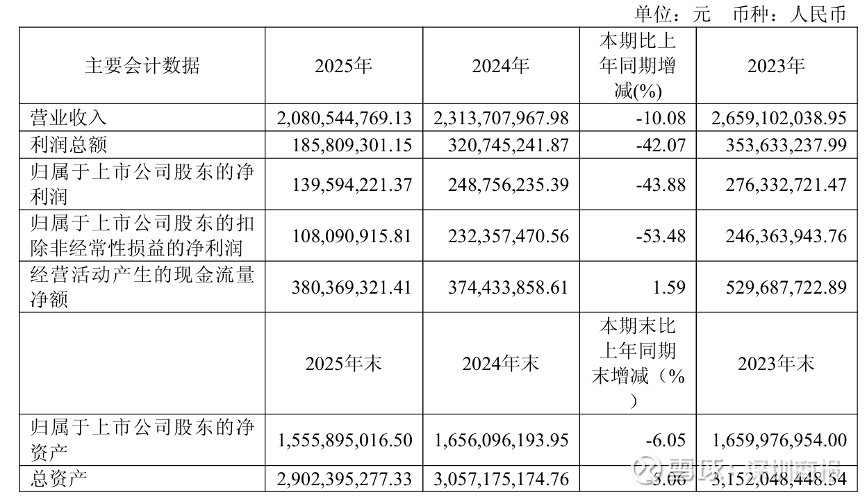3月27日晚间,元祖股份(603886)发布2025年年度报告,公司实现营业总收入20.81亿元,同比下降10.08%;归母净利润为1.40亿元,同比大幅下滑43.88%,降幅较2024年的9.98%明显扩大。