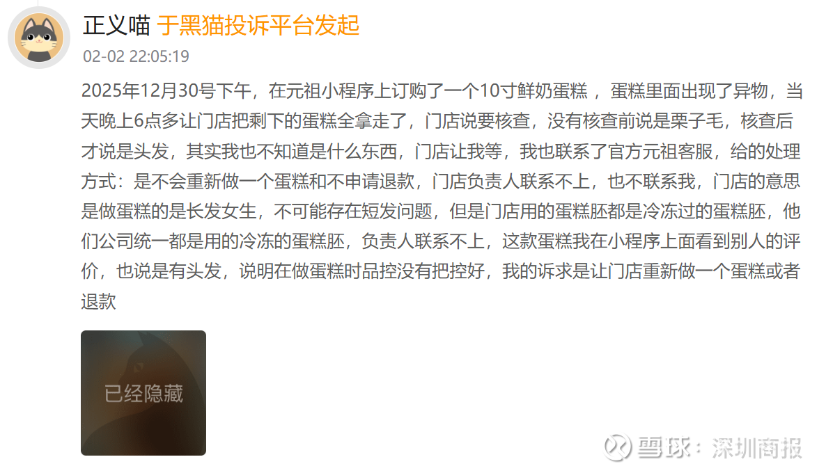 2月2日,有消费者反映,其在元祖小程序上订购了一个10寸鲜奶蛋糕 ,蛋糕里面出现了异物,当天晚上让门店把剩下的蛋糕全拿走了,门店说要核查。后门店负责人联系不上,消费者对处理结果不满意。