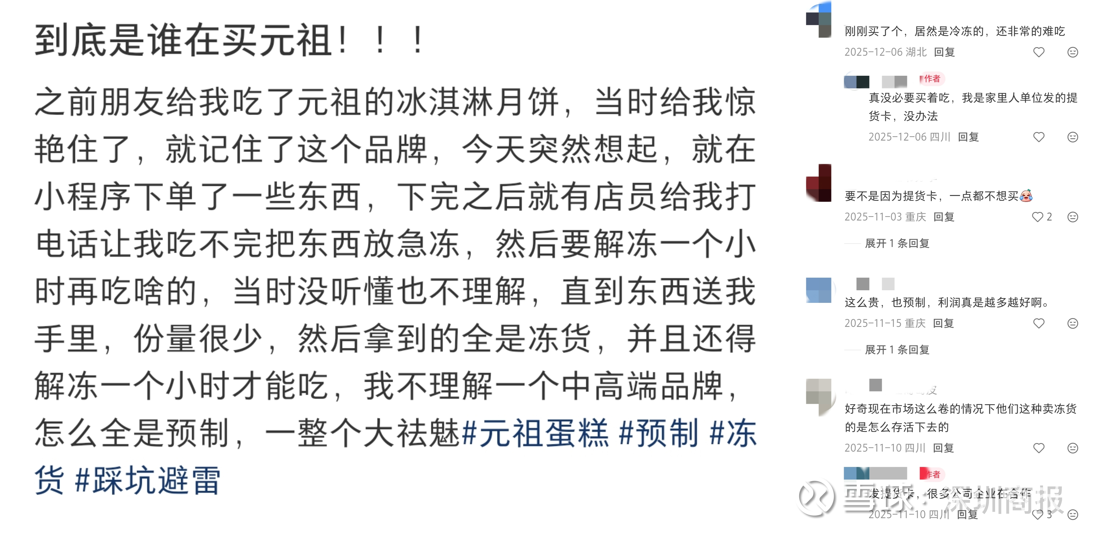 另外社交媒体上,不少网友吐槽元祖的蛋糕卷、三明治等日常产品分量较小,更有消费者抱怨买到的蛋糕到手还是冻货,需要解冻一小时才能食用。还有人直言:“不理解一个中高端品牌,怎么全是预制。”