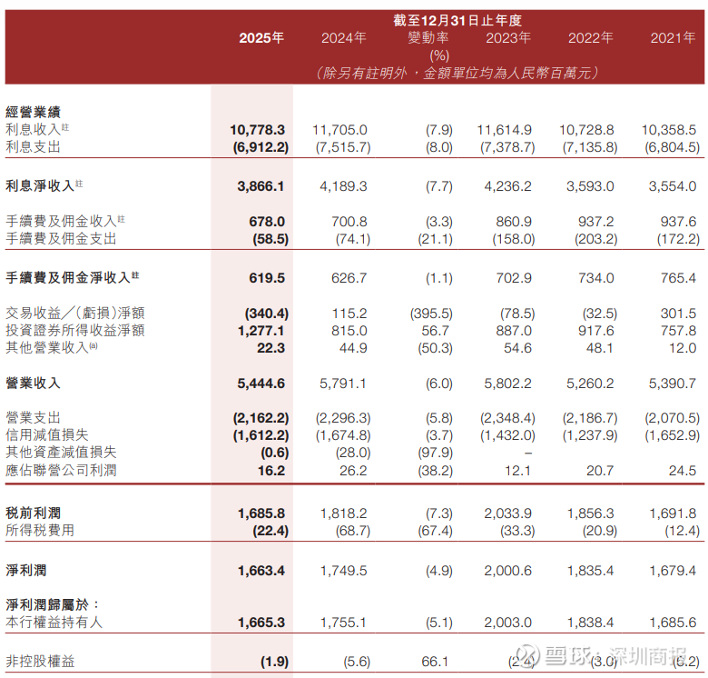 此外,公司2025年手续费及佣金净收入下降。由截至2024年12月31日止年度的人民币6.27亿元减少1.1%至截至2025年12月31日止年度的人民币6.20亿元。手续费及佣金收入下降一是受银行承兑汇票敞口余额下降影响,承兑业务手续费收入下降;二是由于贸易融资业务模式调整,结算及清算手续费收入下降;三是受消费市场影响,银行卡服务手续费收入下降。