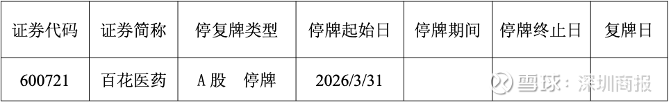 鉴于本次股权协议转让事项正在洽谈当中,尚存在不确定性,根据有关规定,经公司申请,公司股票(证券代码:600721,证券简称:百花医药)将于2026年3月31日(星期二)开市起停牌,预计停牌时间不超过2个交易日。