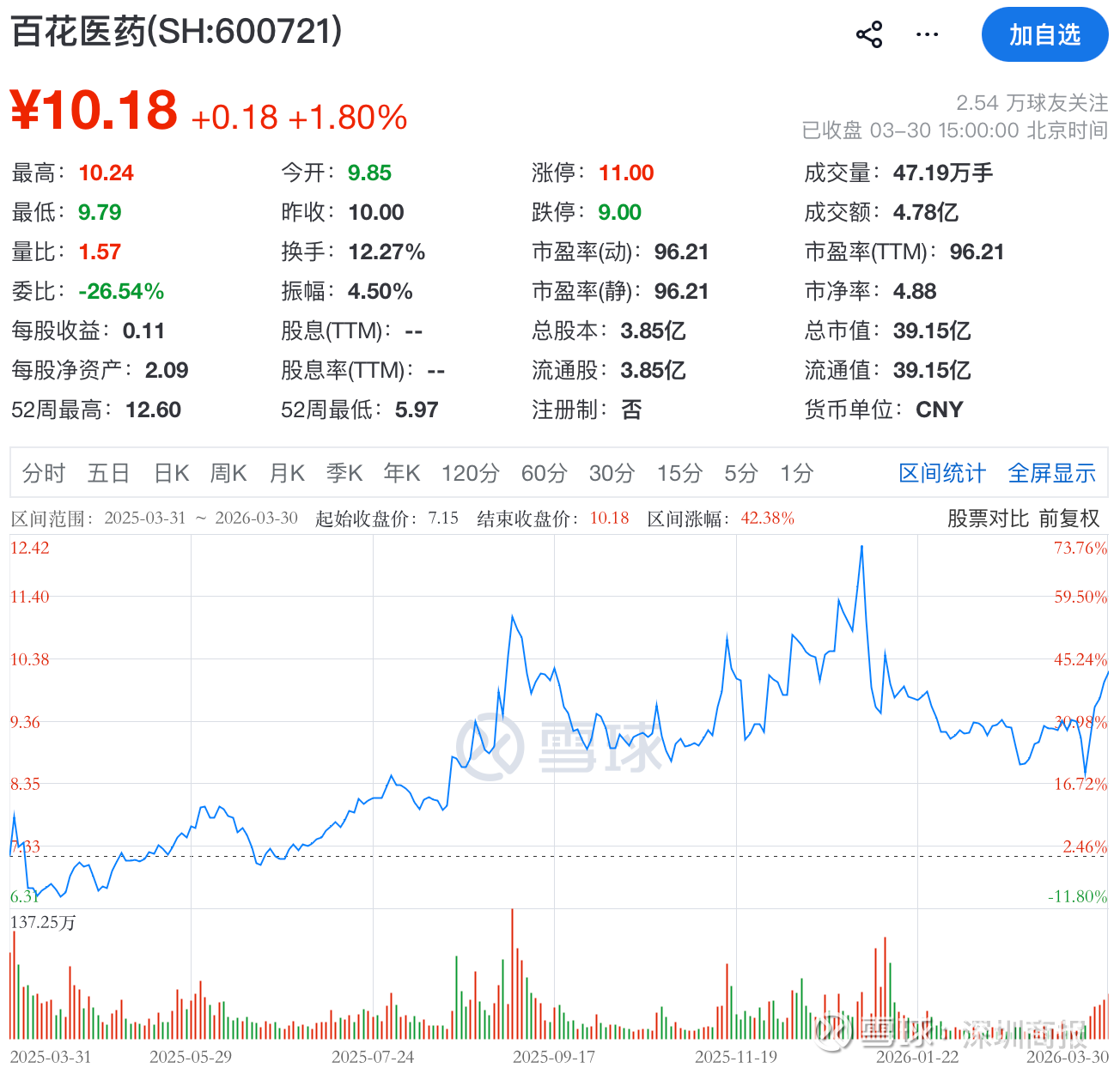 二级市场上,截至3月30日收盘,百花医药涨1.80%,报10.18元/股,总市值39.15亿元。