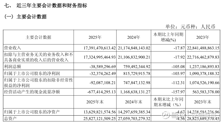 3月30日,开滦股份(600997)公布2025年年报,公司营业收入为173.91亿元,同比下降17.87%;归母净利润亏损3237万元,同比下降103.97%,转盈为亏;扣非归母净利润亏损9209万元,同比下降112.31%;经营现金流净额为-6.77亿元,同比下降157.97%;EPS(全面摊薄)为-0.02元。