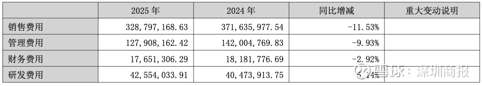 数据显示,2025年,公司销售费用328,797,168.63元,同比减少11.53%;管理费用127,908,162.42元,同比减少9.93%;财务费用17,651,306.29元,同比减少2.92%;研发费用42,554,033.91元,同比增加5.14%。