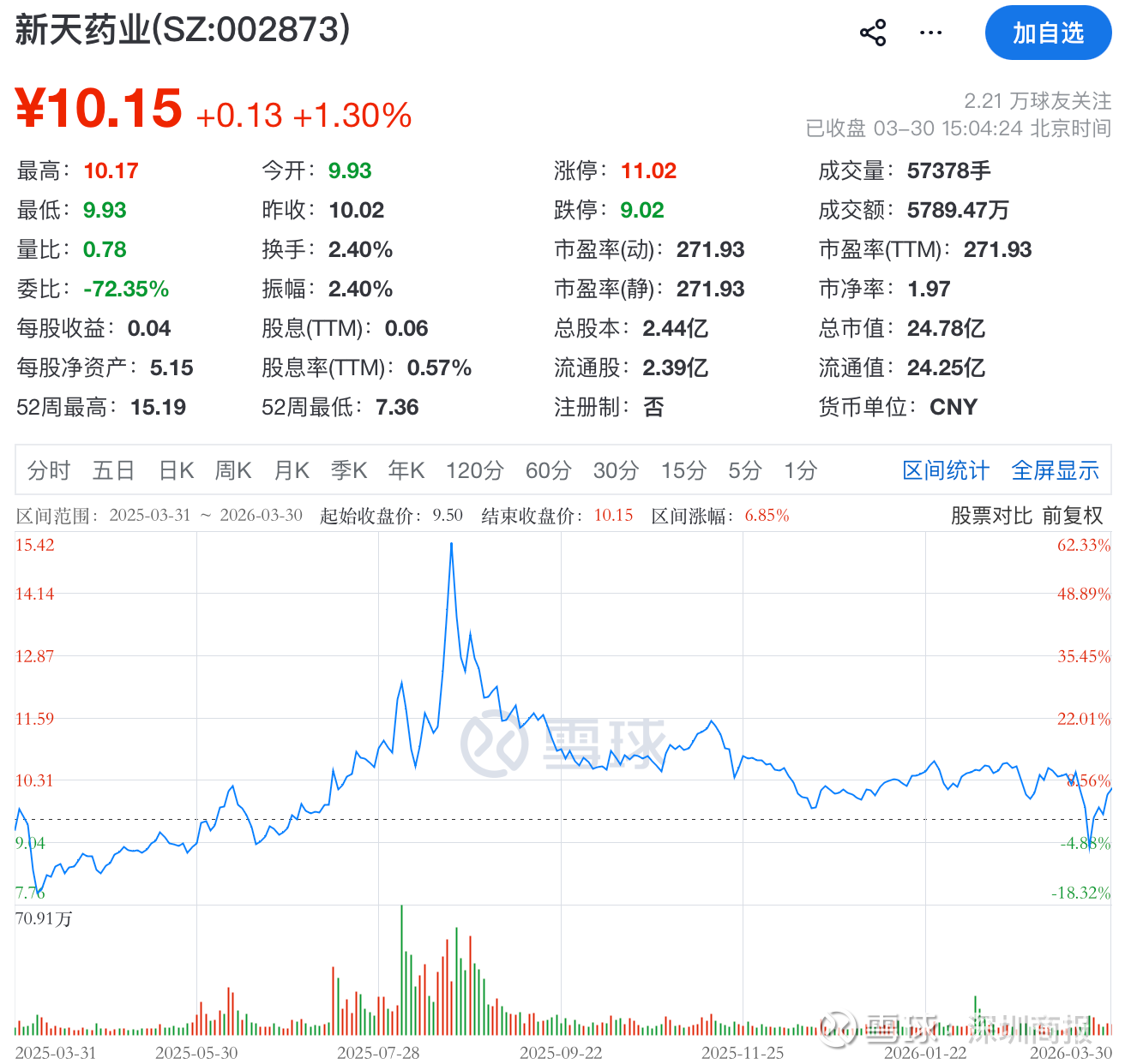 二级市场上,截至3月30日收盘,新天药业涨1.30%,报10.15元/股,总市值24.78亿元。