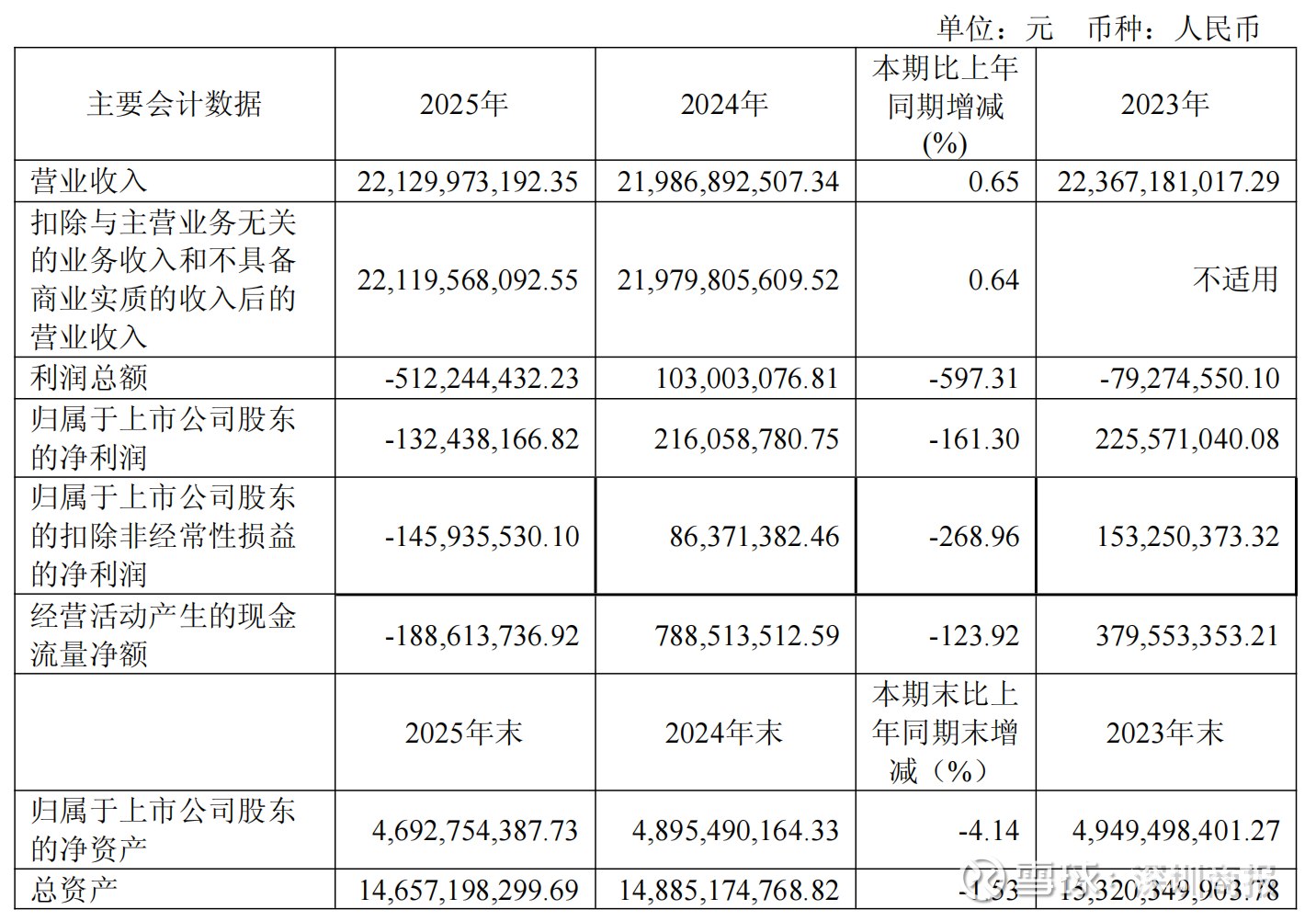 3月30日,光明肉业(600073)披露年报,2025年,公司实现营业收入221.30亿元,比上年度219.87亿元同比增加1.43亿元,增幅0.65%;归母净利润-1.32亿元,比上年度2.16亿元减少3.48亿元,降幅161.30%;扣非净利润-1.46亿元,比上年度8637.14万元减少2.32亿元,降幅268.96%;实现每股基本收益-0.14元/股,较上年度0.23元/股减少0.37元/股。