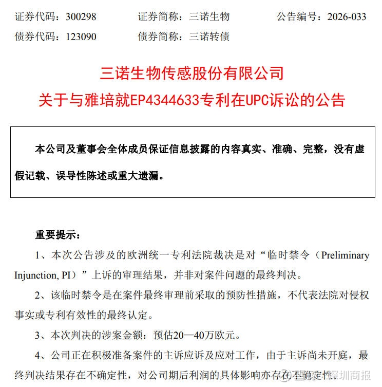 4月1日,三诺生物(300298)发布公告,公司收到欧洲统一专利法院(UPC)关于EP4344633专利上诉结果。