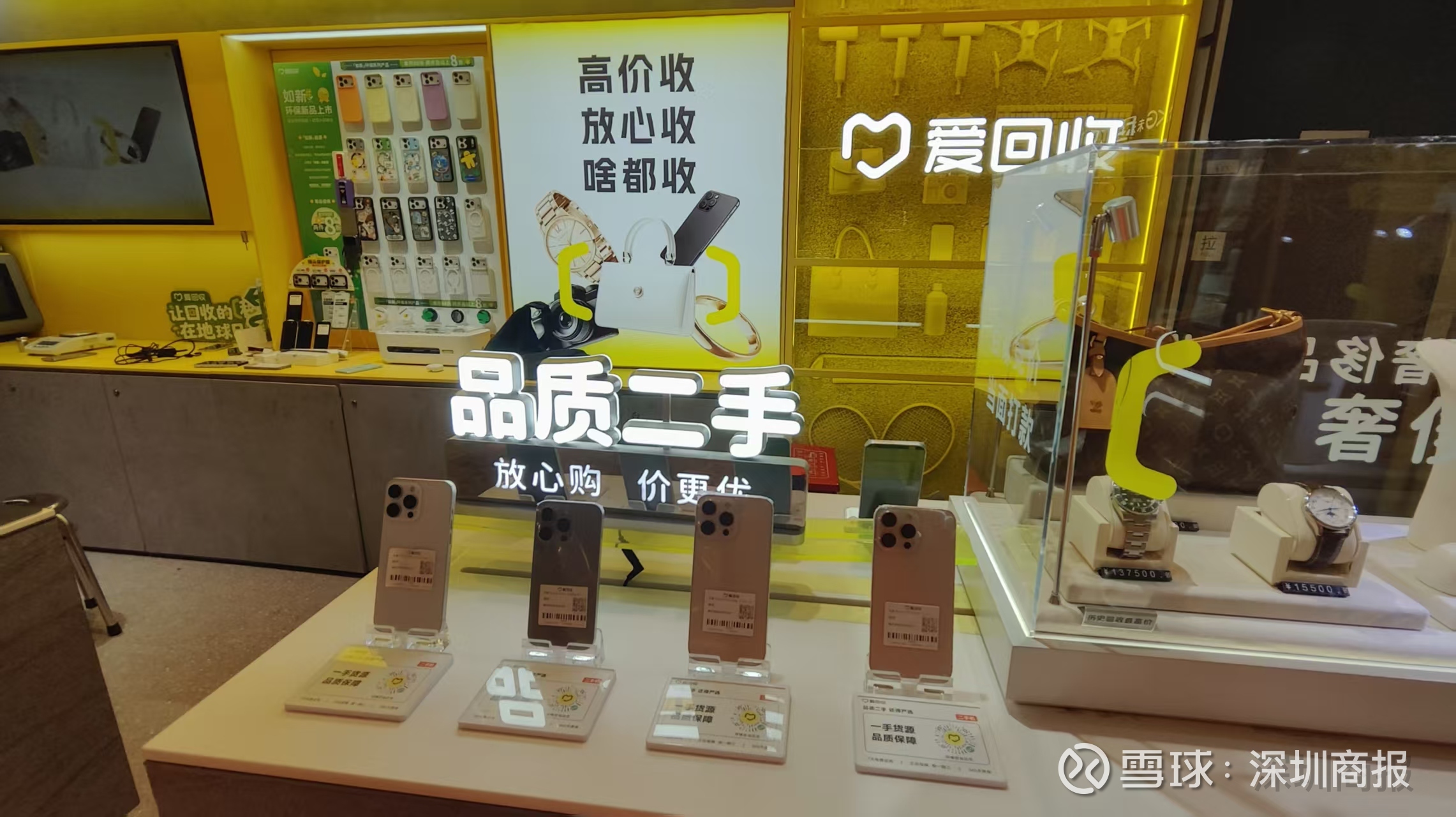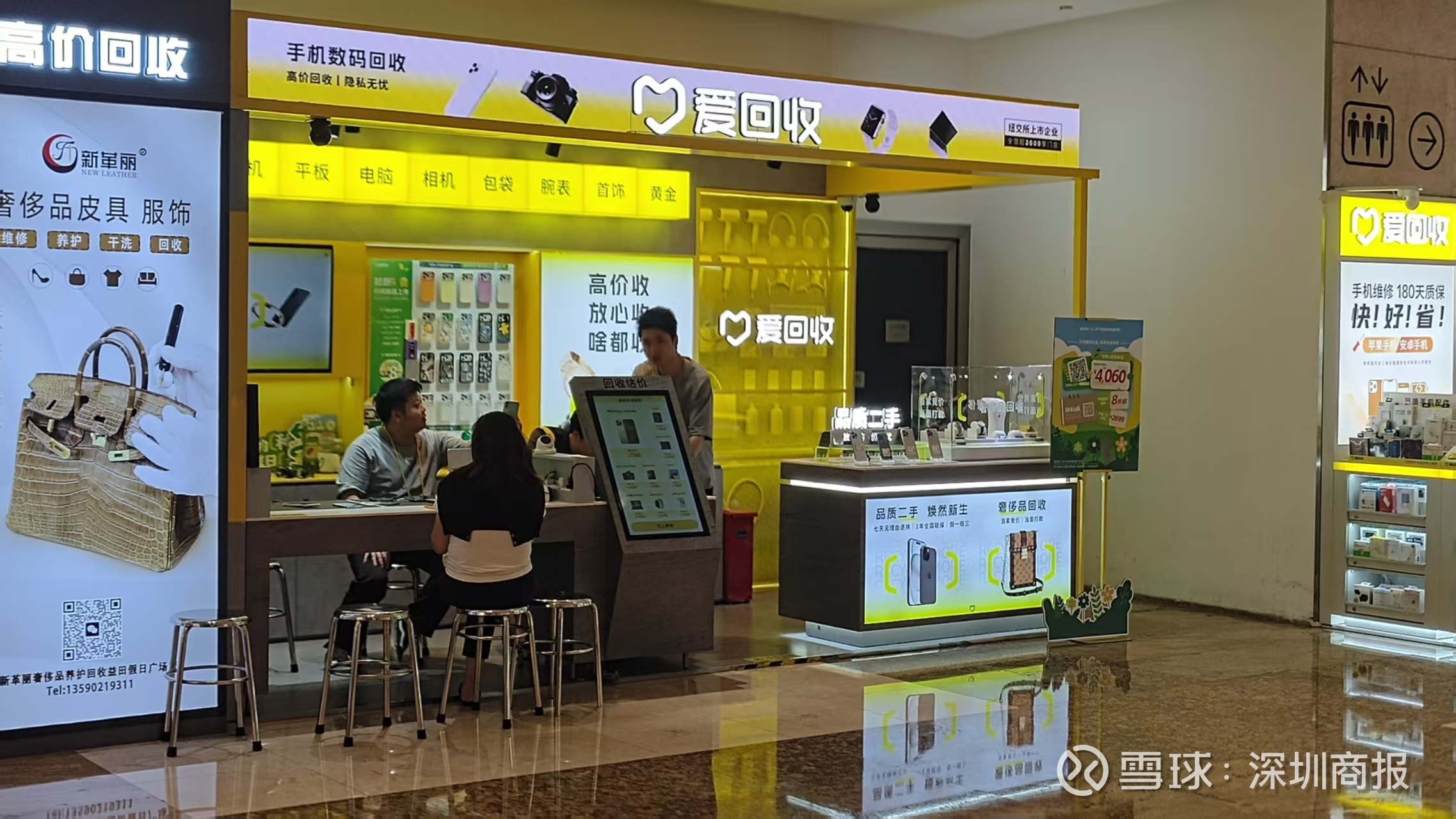 近日,记者实地走访了深圳多家爱回收线下门店,记者发现,其线下门店主要是作为回收和展示之用。其回收种类不仅包括手机、电脑等电子产品,还包括劳力士手表、奢侈品包包、茅台酒,以及黄金等。