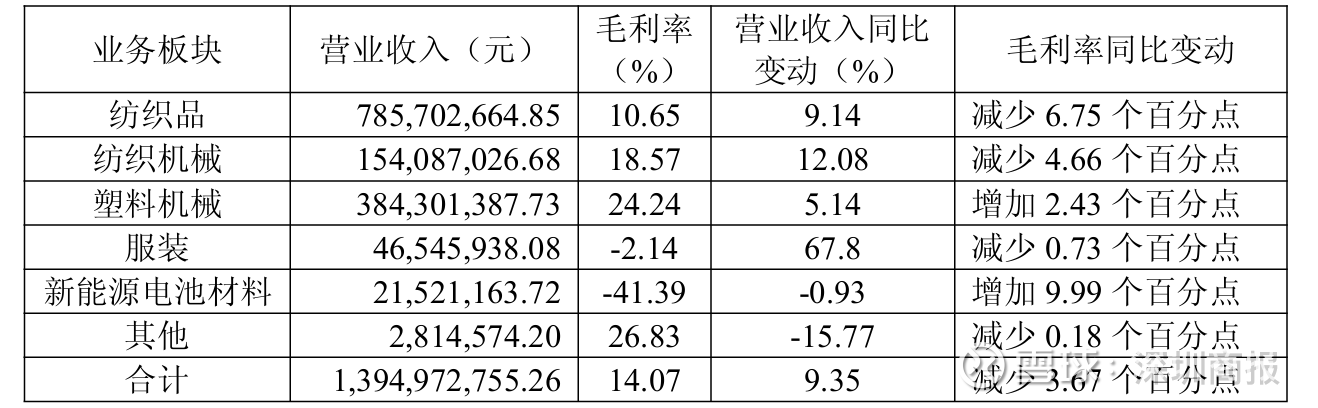 财报显示,2025年,金鹰股份纺织品毛利率同比减少6.75个百分点至10.65%;纺织机械毛利率同比4.66个百分点至18.57%;塑料机械毛利率同比增加2.43个百分点至24.24%;其他产品毛利率同比减少0.18个百分点至26.83%。公司服装业务、新能源电池材料毛利率分别为-2.14%、-41.39%。
