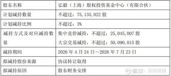 公告显示,本次拟减持股份来源为协议转让取得,减持原因为股东财务安排。截至本公告披露日,股东弘毅(上海)股权投资基金中心(有限合伙)持有公司股份150,352,944股,占公司总股本的6.00%。