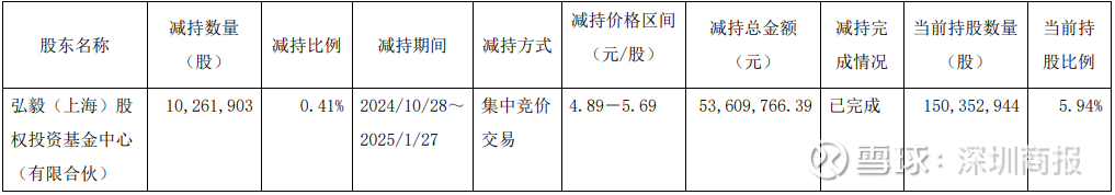 2025年2月6日,公司于2025年1月27日收盘后收到公司股东弘毅(上海)股权投资基金中心(有限合伙)发来的《减持公司股份进展告知函》,弘毅(上海)股权投资基金中心(有限合伙)自2024年10月28日至2025年1月27日通过集中竞价交易方式减持公司股份10,261,903股,占公司总股本的比例0.41%。截至该公告披露日,该次减持计划披露的减持时间区间届满,减持计划结束。
