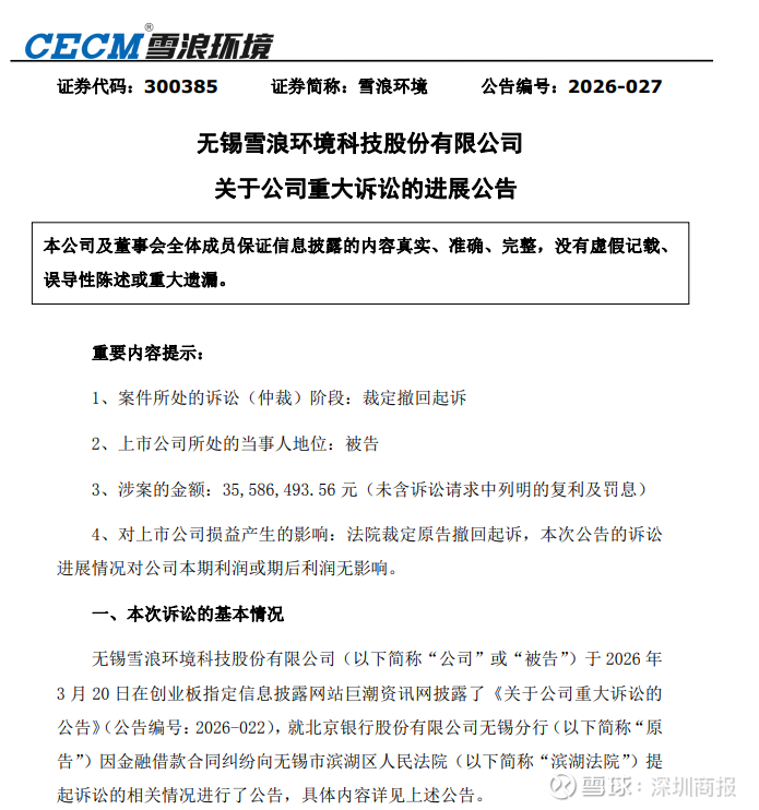 4月2日,雪浪环境(300385)发布关于公司重大诉讼的进展公告,原告北京银行股份有限公司无锡分行因金融借款合同纠纷对公司提起诉讼,涉案金额为3559万元(未含复利及罚息),公司近日收到《民事裁定书》,因原告未在七日内预交案件受理费,法院裁定按撤回起诉处理。