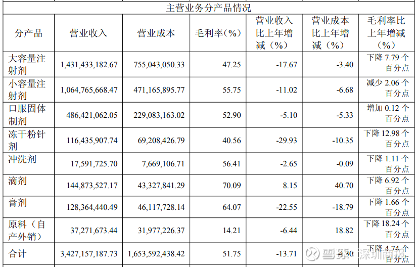 此外,小容量注射剂收入10.65亿元,同比下降11.02%;口服固体制剂收入4.86亿元,同比下降5.10%;滴剂收入1.45亿元,同比增长8.15%,成为为数不多的增长点;膏剂收入1.28亿元,同比下降22.55%。