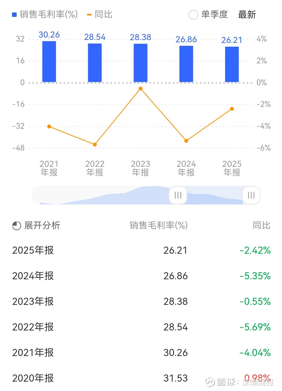 值得一提的是,公司毛利率已连续五年走下坡路,从2020年的31.53%降至2025年的26.21%,5年累计下滑5.32个百分点。