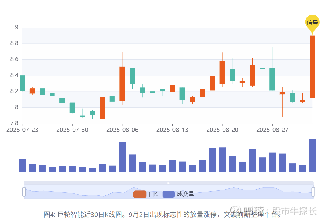 近期市场风格分化显著。沪深300指数在8月录得超过10%的强劲涨幅,显示大盘蓝筹情绪回暖。然而,代表小盘股的中证1000指数表现疲软,尤其在9月2日大跌-2.5%。这种“大强小弱”的背景,使得巨轮智能(小市值)的逆市涨停信号意义更加凸显,它更像是一次独立的资本事件,而非板块性的风格切换。