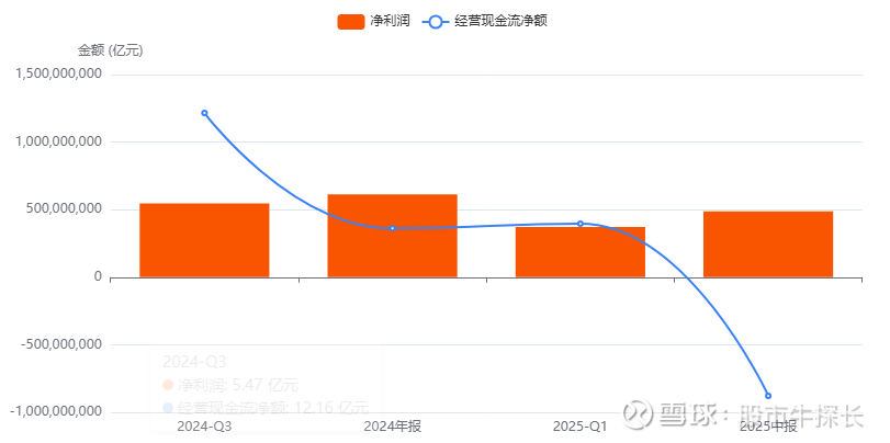 上图中净利润(橙色柱)保持正值,但经营现金流净额(蓝色线)在近期急剧转负,形成了巨大的“剪刀差”,揭示了公司潜在的流动性风险。