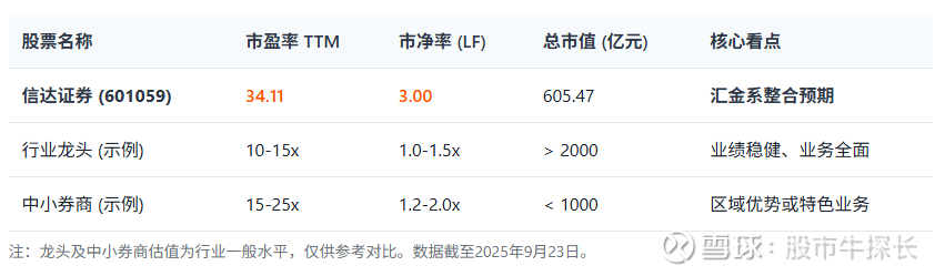 剔除“汇金溢价”后,信达证券的基本面和估值在行业内并不突出。当前的估值水平是为未来可能性支付的费用,一旦预期被证伪或长期不兑现,股价向行业均值回归的风险是巨大的。