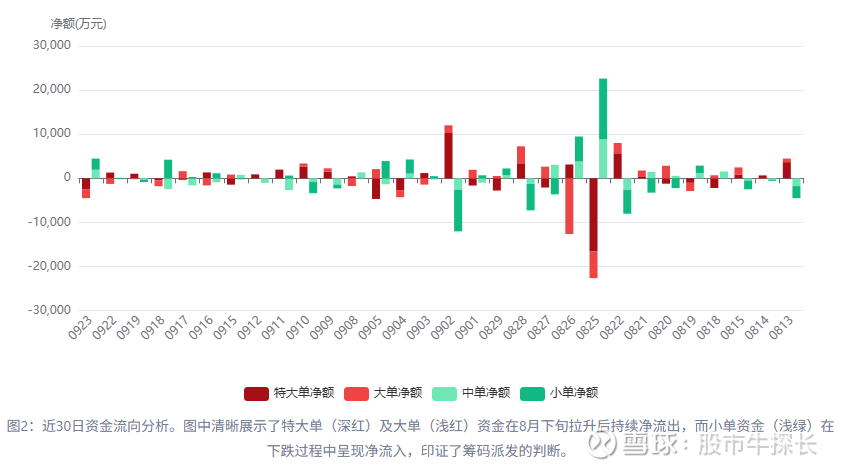 高位派发 (8.25至今): 拐点出现在8月25日,当日股价创下21.69元的阶段性高点,但特大单净流出高达1.66亿,而小单净流入1.38亿。这是典型的机构向散户派发筹码的信号。此后,这一趋势愈演愈烈。