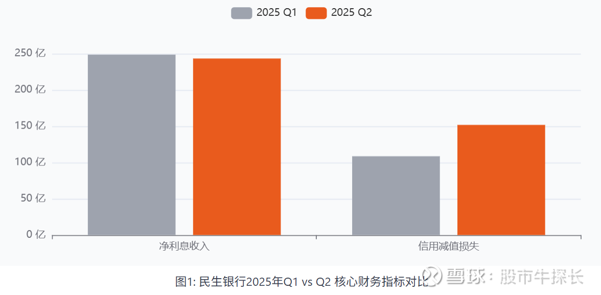 上图清晰地展示了民生银行在2025年第二季度的核心业务困境。代表主营业务盈利能力的净利息收入出现环比下滑,而反映资产质量压力的信用减值损失却大幅攀升。这一“一降一升”的剪刀差,揭示了财报增长背后的结构性隐忧。