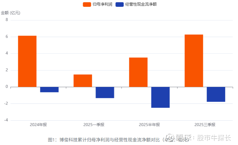 上图直观地展示了自2024年底以来,博俊科技的净利润(橙色柱)持续增长,而经营性现金流(蓝色柱)却持续为负,两者形成了巨大的“剪刀差”。这种背离是财务健康状况恶化的明确信号,警示投资者利润增长的质量存在严重问题。