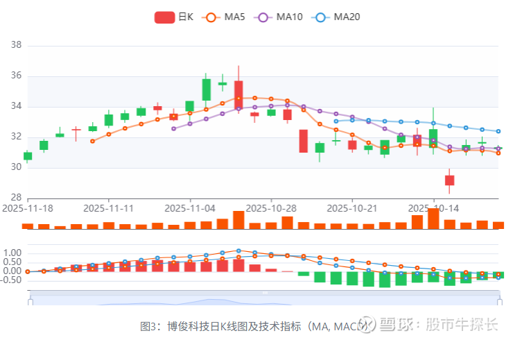 从日K线图可见,股价自高点回落后,均线系统已呈空头排列态势。下方的MACD指标绿柱持续放大,显示下跌动能仍未完全释放。上方32.5-34元区域(20日均线和前期震荡平台)已构成强压力区。下方第一支撑在30元附近(60日均线),若有效跌破,则下一个重要支撑平台在26-28元区域。