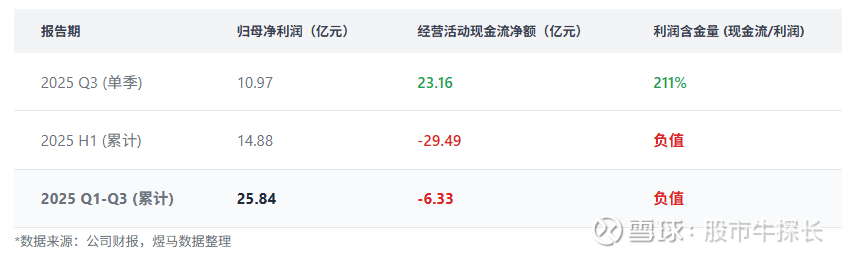 2025年前三季度,公司在创造 25.84亿元 归母净利润的同时,经营活动现金流净额却为 -6.33亿元。