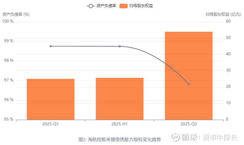 图表清晰显示,尽管Q3资产负债率从接近99%的高位首次出现明显下降至96.8%,但仍处于极高水平。股东权益虽有回升,但仍为负值。这是一个不容忽视的巨大风险点,意味着公司依然脆弱。资产负债表的修复速度,是决定海航长期投资价值的核心跟踪变量。