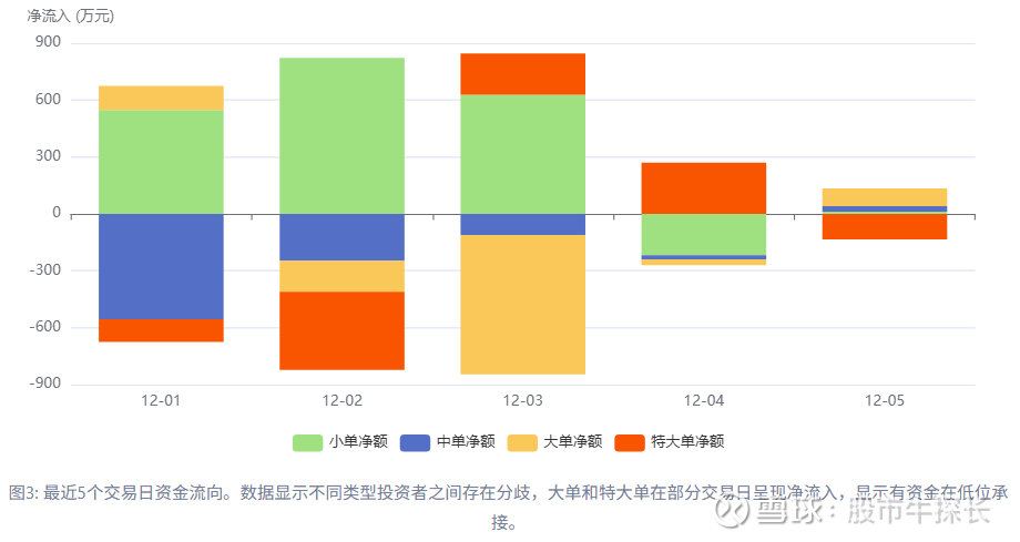 最近5个交易日的数据显示,资金博弈激烈。虽然小单和中单整体呈净流出,但12月3日和5日均录得资金净流入,表明在低位已有先知宣觉的资金开始尝试吸筹,但尚未形成主导力量。