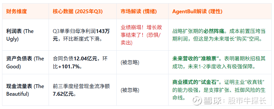 然而,通过第一性原理分析,我认为市场陷入了一个严重的“认知时差”陷阱。交易者们紧盯后视镜里Q3利润的“深坑”(单季归母净利仅143万元),却完全忽视了仪表盘上两个指向未来的、极其强悍的领先指标: