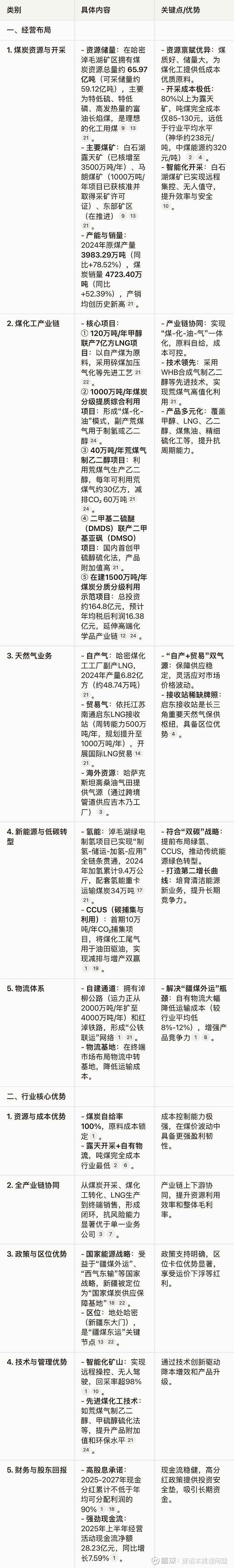 广汇能源的核心竞争力在于“优质资源+全产业链+低成本+政策区位” 的四重优势叠加。公司以哈密富油煤资源为基础,通过煤化工深度转化提升附加值,并布局氢能、CCUS等绿色技术,正从传统能源供应商向“绿色低碳综合能源服务商”转型。随着马朗煤矿等优质产能释放、1500万吨/年煤炭分质利用项目投产,以及“疆煤外运”通道能力提升,公司长期成长空间明确。
