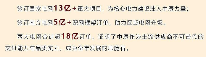 2025年,中辰股份获两大电网合计超18亿元订单。分别为:签订国家电网超13亿元重大项目,及南方电网超5亿元配网框架订单。重大电网建设工程的持续扩容,对应电网业务有望同步增长,将进一步提升企业经营业绩。