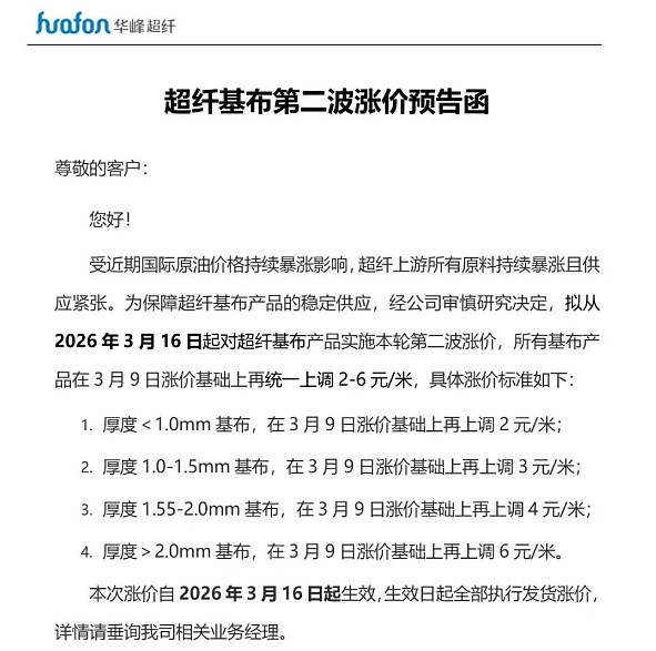 $华峰超纤(SZ300180)$ 3月4日,上海华峰超纤科技股份有限公司发布《超纤基布涨价预告函》。华峰超纤宣布自3月9日起,对旗下超纤基布产品进行第一波调价,上调幅度为1-4元/米,具体按产品厚度分级执行。后续价格还会跟着国际原油及原材料价格进行调整。