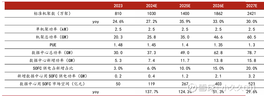 目前,SOFC卡点还在于成本高(例如BE约3400美元/kw,单GW约234亿人民币),产业链还不完善,但SOFC的商业化趋势已经非常明显,未来随着电池进步和成本降低,SOFC在数据中心的应用将更为广泛,市场份额将持续增长,预计2027年数据中心用SOFC市场空间有望达到523亿元。