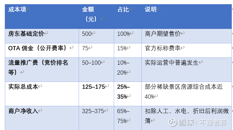 OTA平台对中小民宿的典型成本结构(以单间夜500元为例)