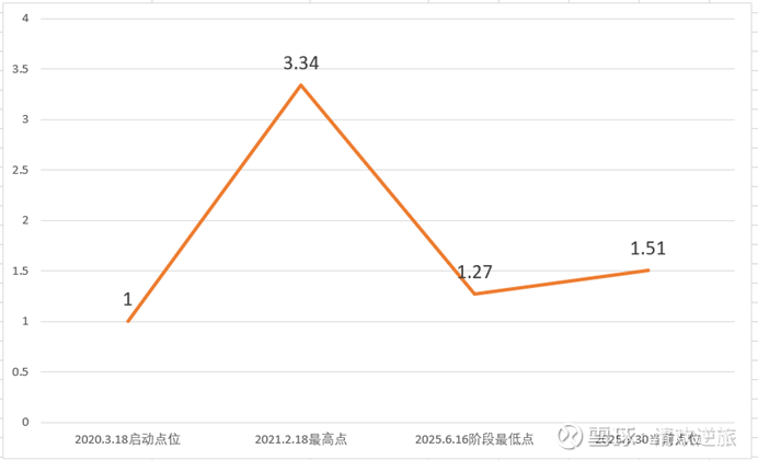 白酒在2020年至2021年有一波牛市。指数从2019年开始了长达一年的横盘,股价在此期间反反复复来回拉锯,2020年年初一波凌厉的下跌后,2020年3月19日指数到达启动前的最低点6479.61,至此开启了长达一年的单边上涨,2021年2月18日到达指数最高值21663.85。此后中证白酒指数转头向下,震荡磨底已经4年半有余,期间指数最低点到达过8251.41,节前指数到达9768.08。这样描述中证白酒从2020年开始的走势大家可能不太理解。咱们来简化一下模型。我们以启动前的6479.61为基准,将6479.61设定为1,将此后的历史最高点,阶段最低点,以及当前点位均换算成1的倍数来看。