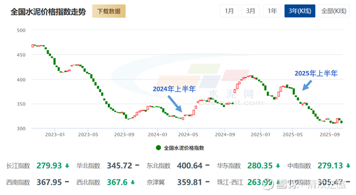 由于水泥是有保质期的,水泥企业一般都是以销定产,不会做太多库存放在家里。水泥需求低了,自然水泥企业的产量也就低了,这个很好理解。更进一步来说,需求不足,自然就带来产品价格下滑。从全国水泥价格指数上看,2025年上半年价格相对于2024年上半年价格有所增长,如图所示。2024年上半年的水泥价格是阶段低点,2025年上半年价格是在和一个低位价格做对比,所以才有了水泥价格增长的结论。
