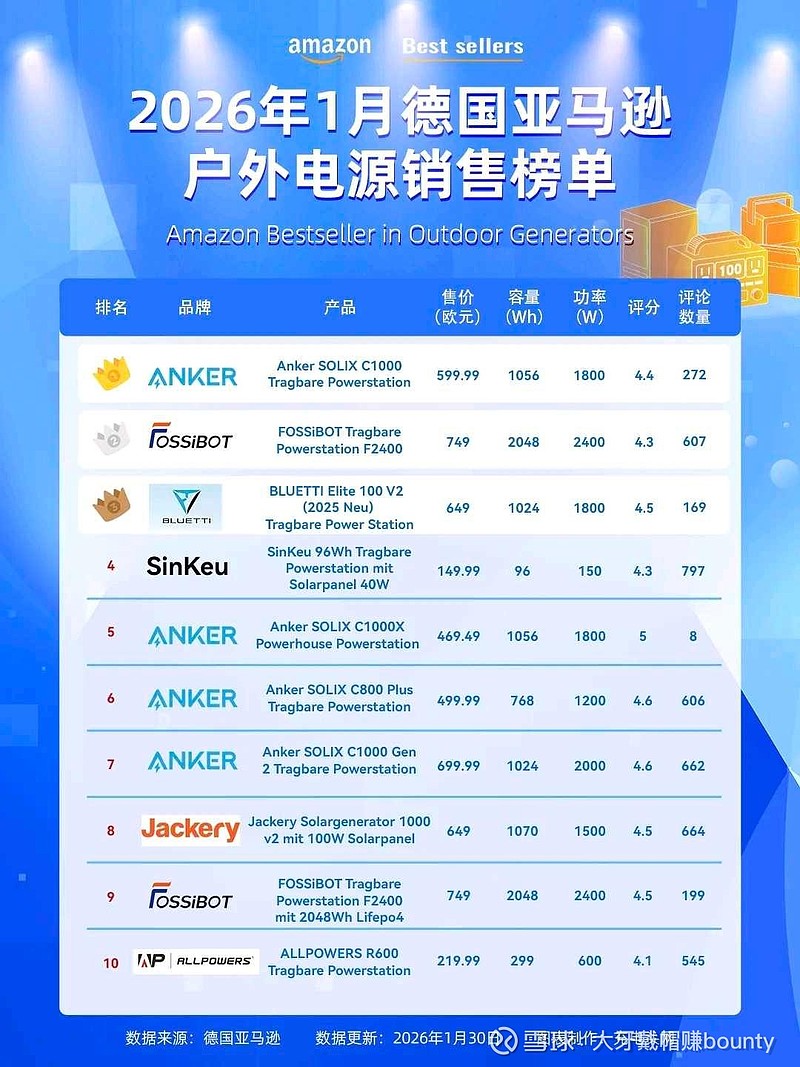 1月户外电源榜单安克包揽四席,这就是品牌力加营销渠道的降维打击
