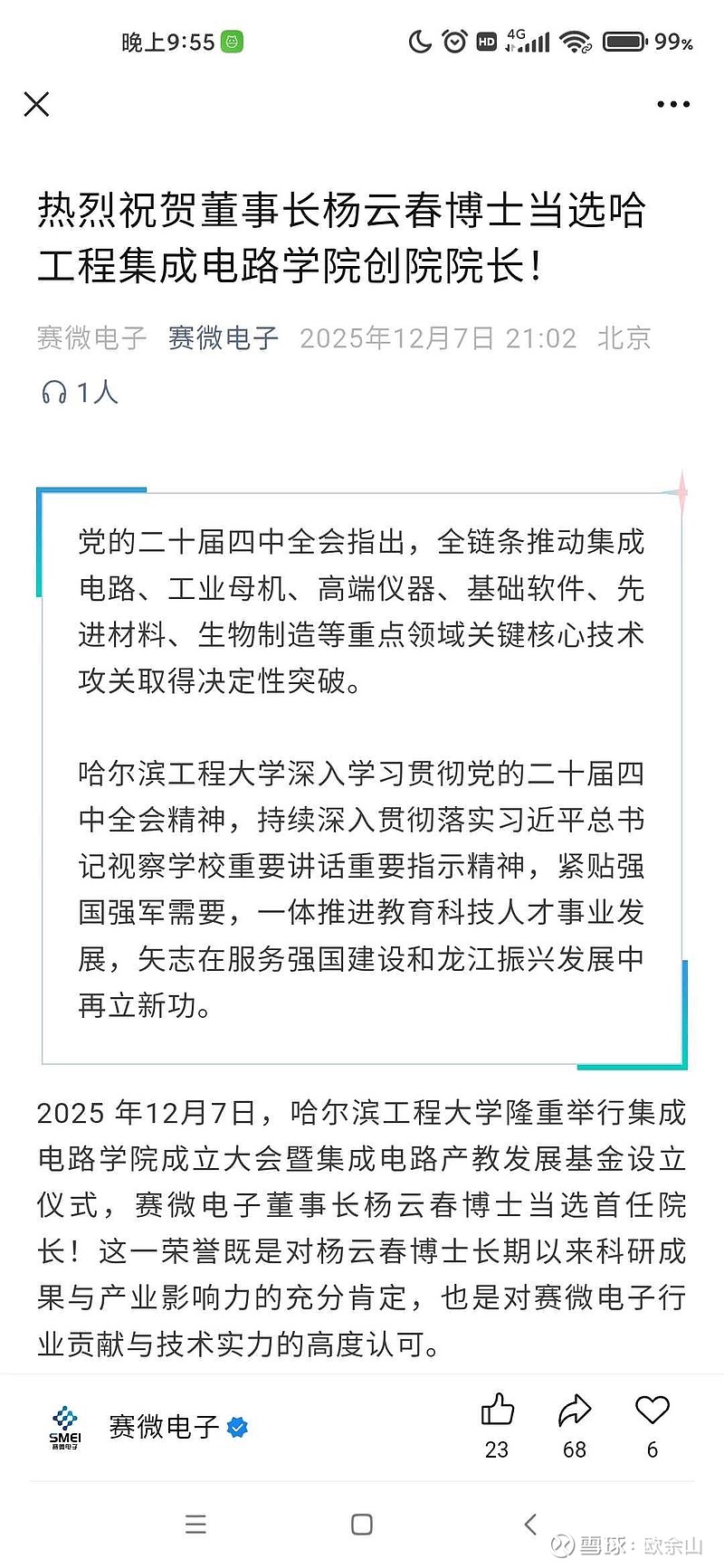 $赛微电子(SZ300456)$最强背书,这份荣耀也属于我们赛维人2025 年12月7日,哈尔滨工程大学隆重举行集成电路学院成立大会暨集成电路产教发展基金设立仪式,赛微电子董事长杨云春博士当选首任院长!这一荣誉既是对杨云春博士长期以来科研成果与产业影响力的充分肯定,也是对赛微电子行业贡献与技术实力的高度认可。