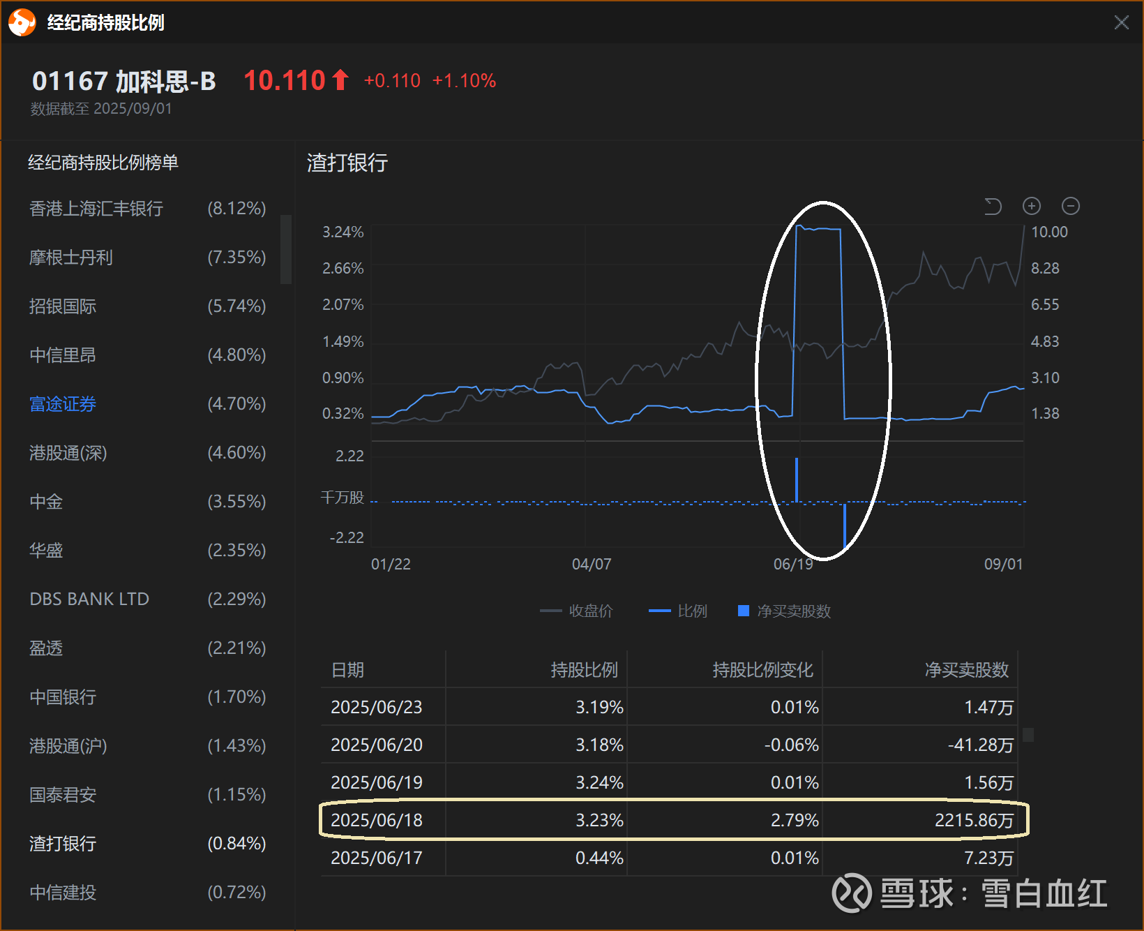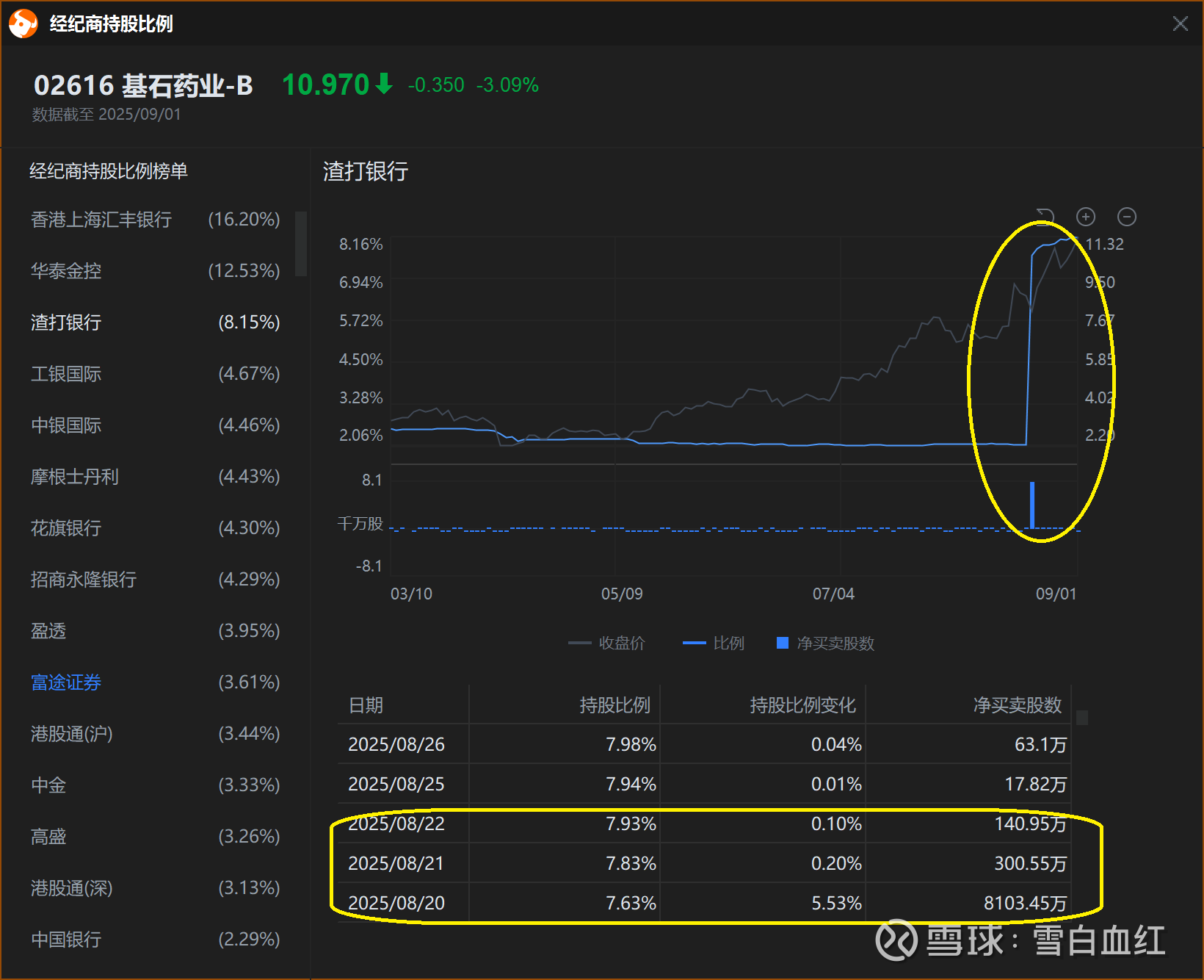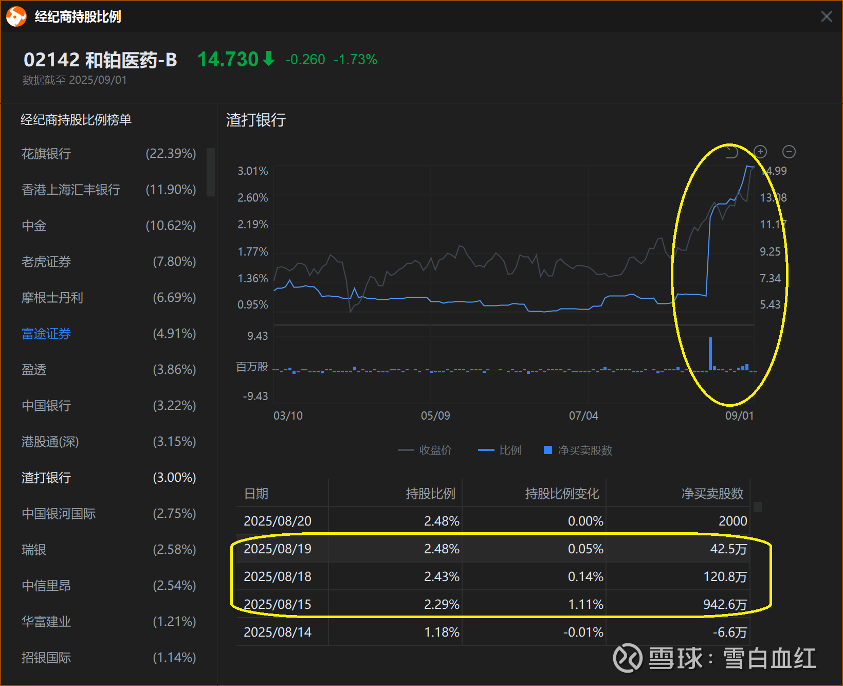 ①、和铂医药:渣打银行前面始终保持0.85-0.95%占比,8月15日开始对倒895万股进来,然后几日均有大额净买入和对倒,然后9月2日举牌;