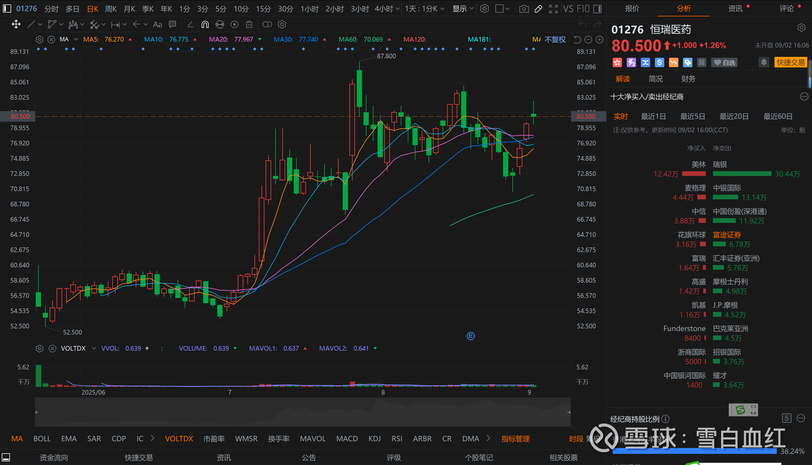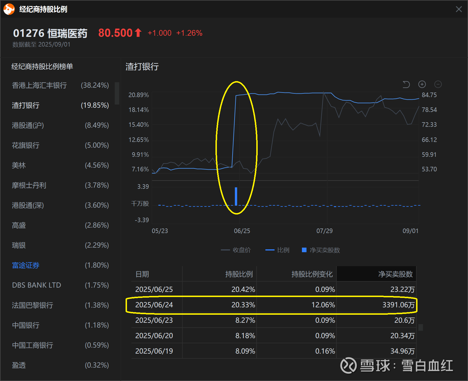 ③、恒瑞制药:渣打一开始持有8%左右IPO基石股份,然后6月24日对倒转入12.91%,3391万股,持股比例迅速达到20%;