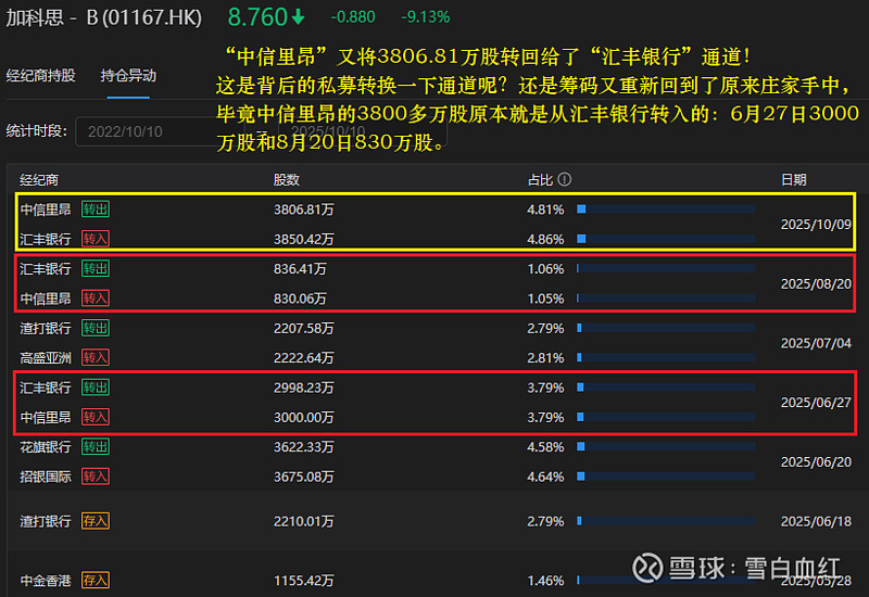 $加科思-B(01167)$ “中信里昂”又将3806.81万股转回给了“汇丰银行”通道!