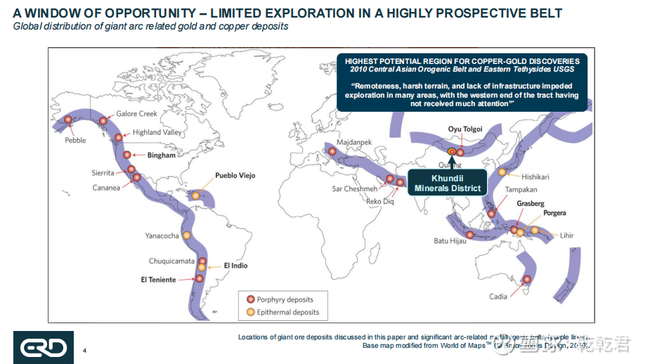 Erdene Resource Development Corporation 于 2000 年在加拿大新斯科舍省成立,主要致力于未充分勘探地区的矿产资源开发。公司在蒙古的探索之旅始于 2009 年,当时启动了西南地区的系统性勘探工作。过去 16 年间,ERD 在蒙古累计投资超过 1 亿美元,成为 Khundii 矿区(KMD)的开拓者。该矿区位于 Edren 岛弧地体,地质特征类似于世界级矿床 Oyu Tolgoi。