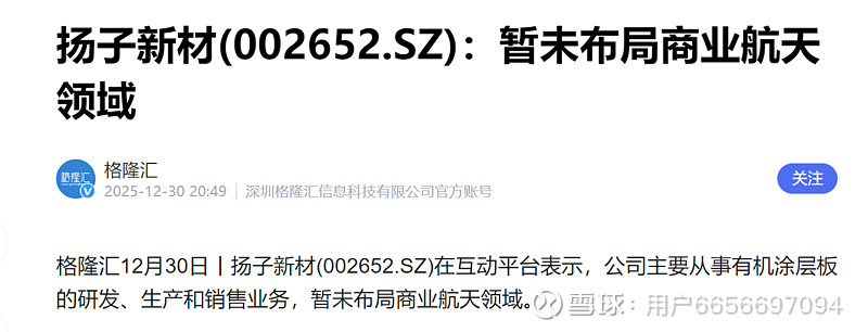扬子新材(002652.SZ)在互动平台表示,公司主要从事有机涂层板的研发、生产和销售业务,暂未布局商业航天领域。$扬子新材(SZ002652)$商业航天公司直接否认了,连续一字跌停跨节了,原来你才是跨节龙
